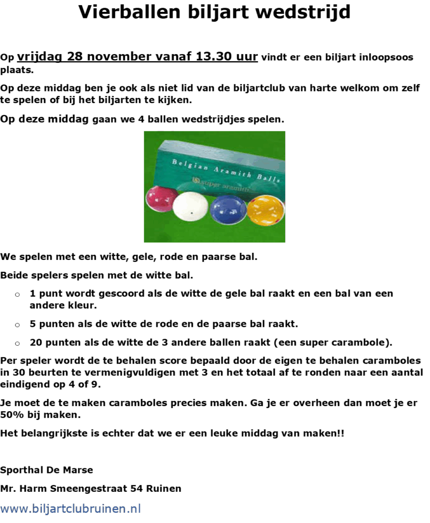 Op 21 november werd een wedstrijd gespeeld in het kader van de interne competitie. Negen spelers speelden 2 partijen tegen elkaar. Lucas Hester overtrof zichzelf het meest en behaalde 188% van zijn te maken caramboles. Harm Bakker was het sterks in het spel met een gemiddelde van 2.44 per beurt.