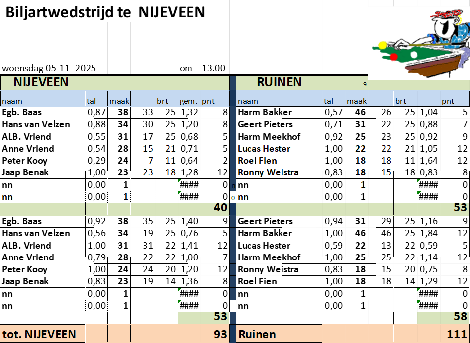 | 10-12 | Nijeveen | 93 | Ruinen | 111 | |