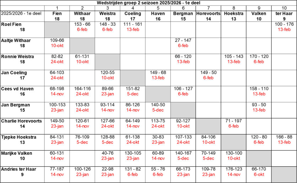 Hier staat de totaalstand t/m de laatst gespeelde wedstrijd.