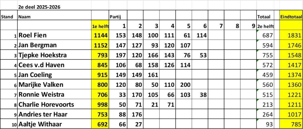 In de eerste tabel staan de punten van de eerste helft van dit seizoen. Er moeten nog een paar wedstrijden gespeeld worden.