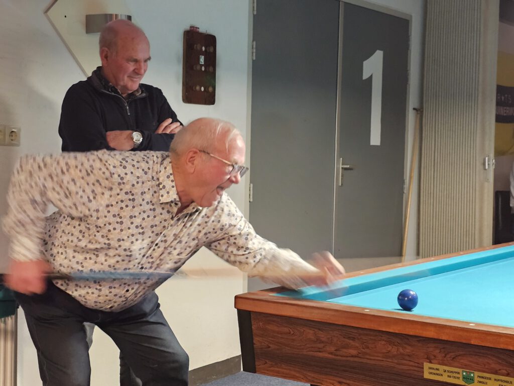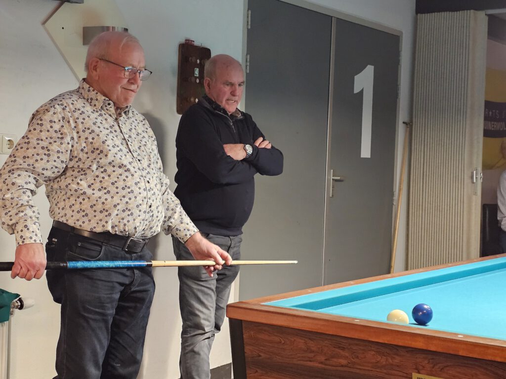 Tijdens het 4 ballen toernooi in Ruinerwold waaraan 120 biljarters aan deelnamen is Albert vijfde geworden. In zijn “finale” partij speelde hij zeer sterk met verschillende 20 punters en kon daarmee al snel het overwinningsapplaus in ontvangst nemen. Hij leek wel wat emotionele steun te krijgen van zijn broer die de arbitrage deed zoals te zien op bijgaande foto’s.
